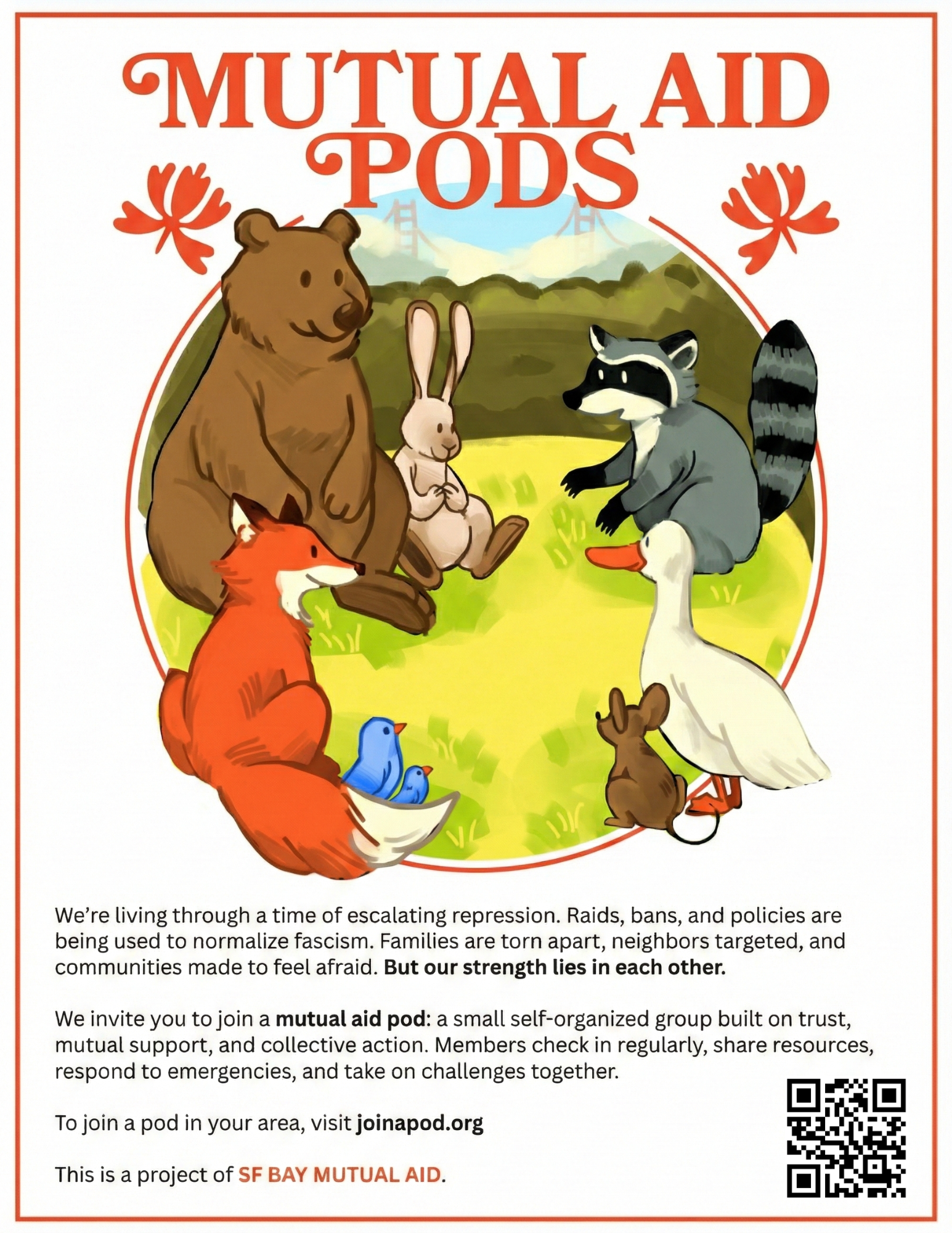 Each pod, usually 4 to 20 people, comes together regularly to support one another, share resources, and take action. Actions might include anti-ICE organizing, neighborhood flyering, offering emergency support to targeted families, hosting political education workshops, joining strikes, or creating spaces for mutual care and connection.
